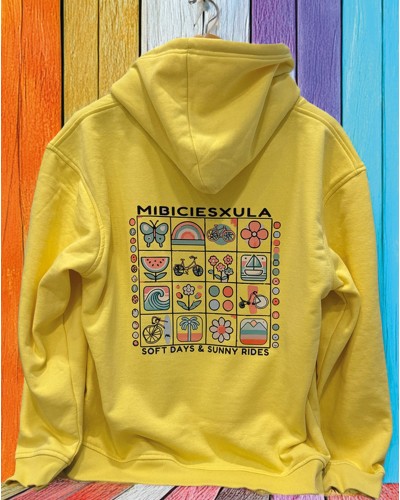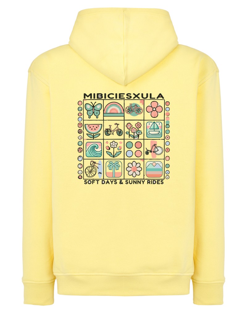 VIBES es puro estilo : sobre una base de suave amarillo vintage, se despliegan iconos de sol, bici y libertad en tonos pastel. Un homenaje a los días largos, los planes suaves y las rutas con flow.