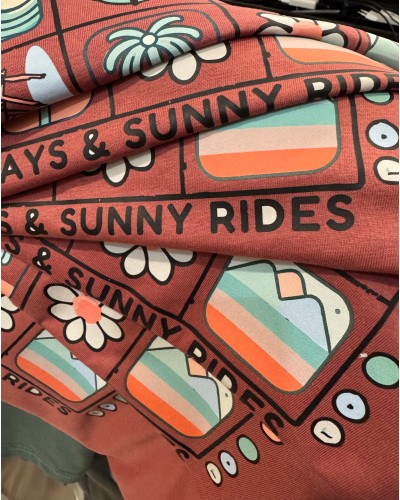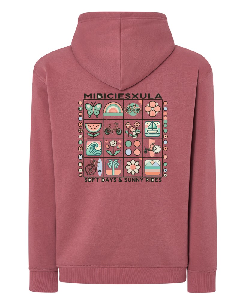 Color teja potente, corte clásico sin capucha y un diseño trasero lleno de pequeños guiños a lo que te gusta: 🌊🌸🚴♂️☀️